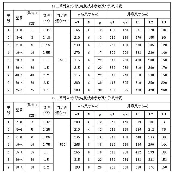 YZUL型振動(dòng)電機(jī)外形安裝尺寸圖表: