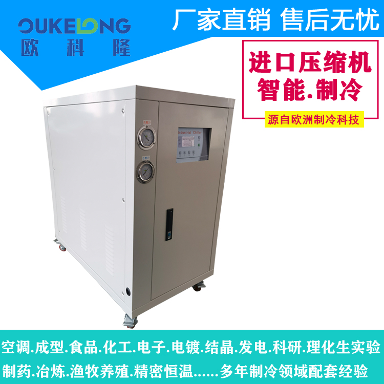 適用場景廣泛,可用于理化生實驗室、高校、電子、電鍍、食品等行業。歐科隆還提供整機免費保修一年、終身售后服務,配送方式有工廠送貨上門和物流送貨上門,交期方面,有庫存配件1 - 3日即可交貨。歐科隆3匹水冷箱式冷水機組以其卓越性能和優質服務,為各行業的制冷需求提供可靠保障。